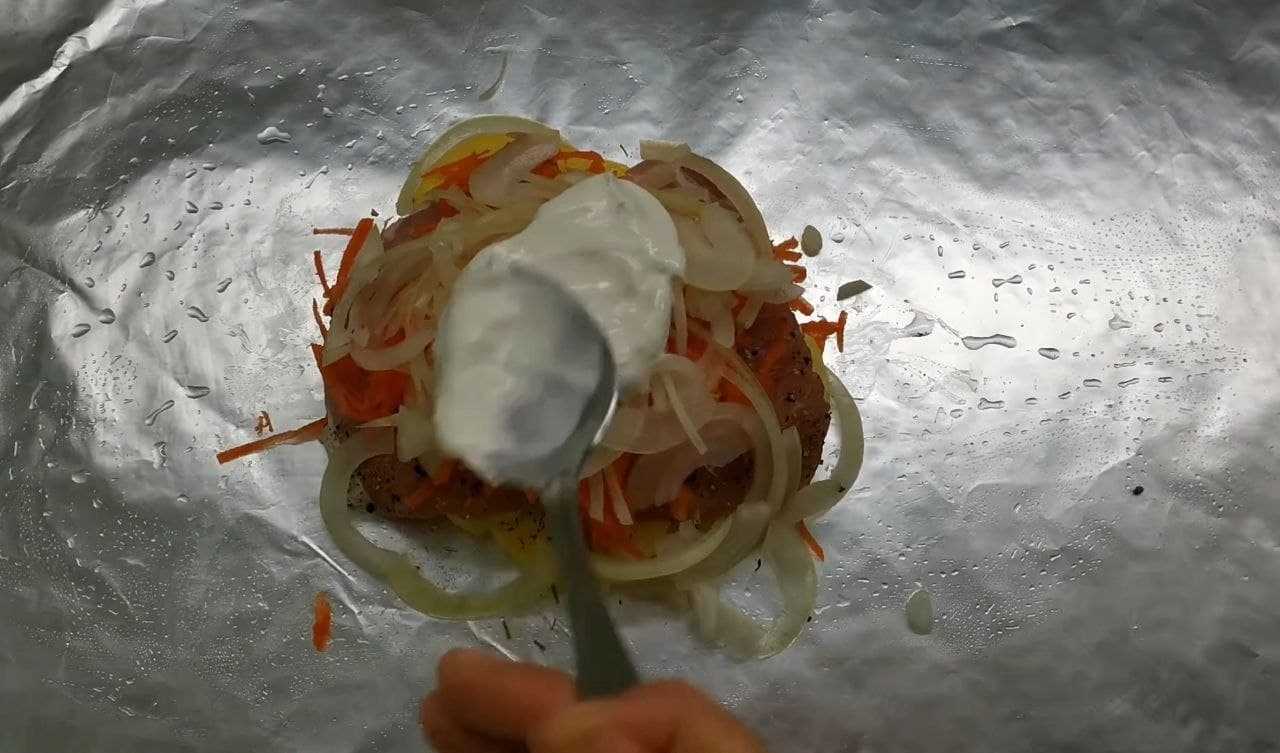 Следующий слой делаем из мяса, солим и перчим, сверху раскладываем жареный лук. Затем слой из моркови, который смазываем майонезом.