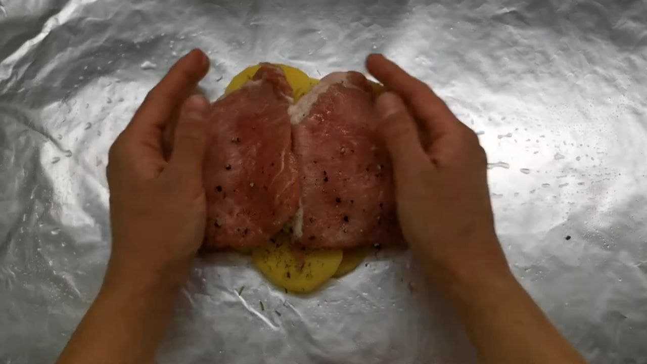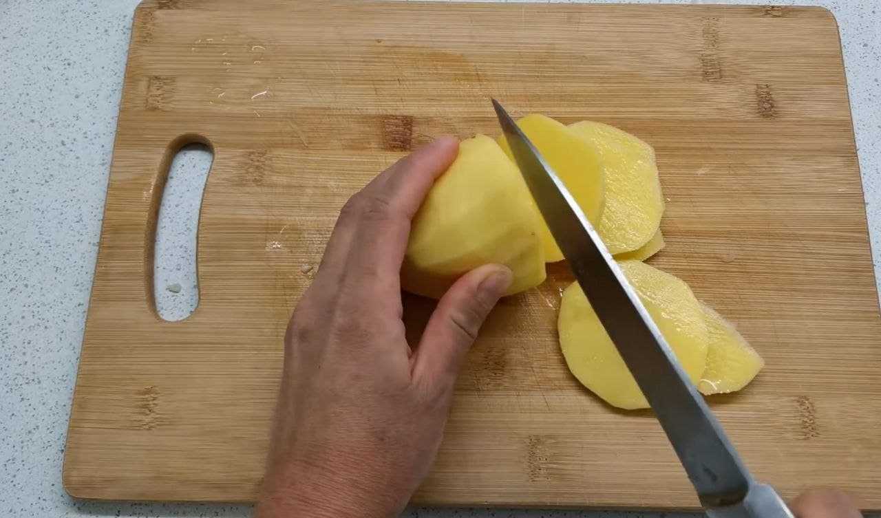 Картофель необходимо почистить и порезать тонкими слайсами. Затем выложить его поверх филе.