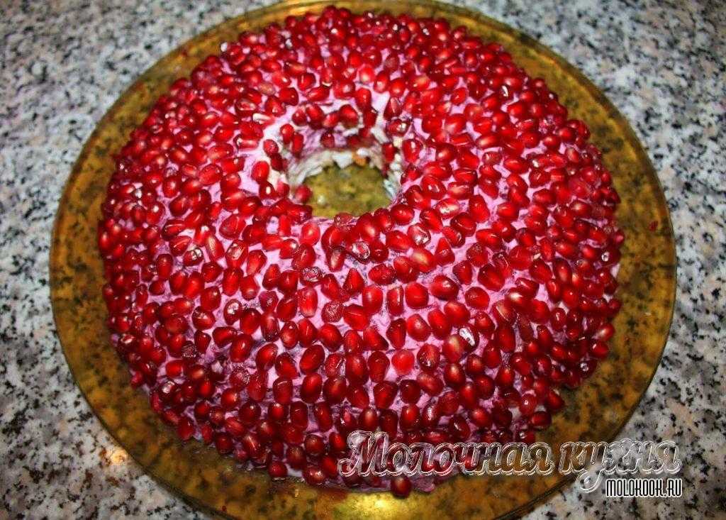- Последний слой – гранат. Благодаря ему салат, собственно, так и назвали. Это классическое украшение блюда.