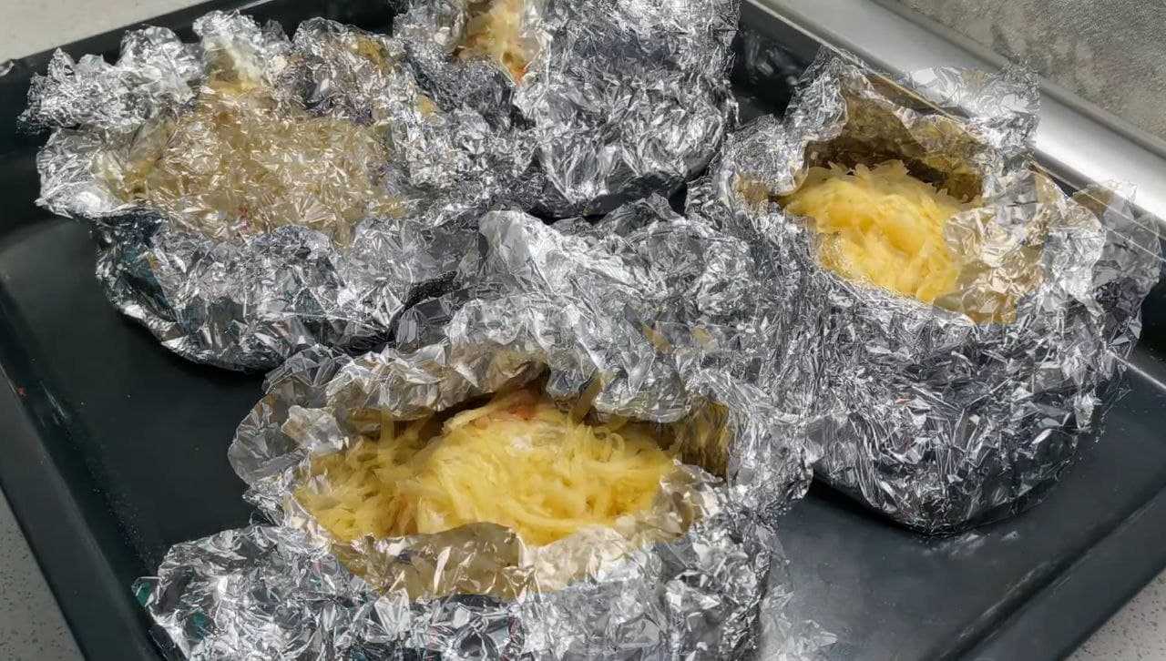 Сверху необходимо покрыть каждый кусочек смесью из предварительно натертого на крупной терке сыра и майонеза, это будет наш последний слой.
