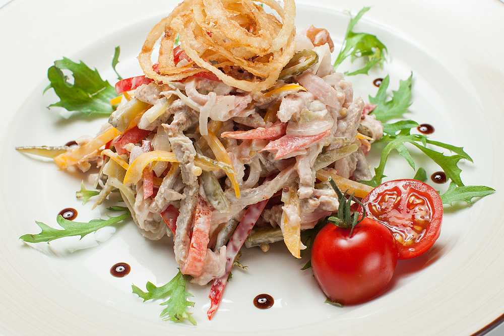 - Затем – основной продукт, мясной компонент. Это может быть курица (отварная, копченая, жареная), говядина, свинина. Мясо мелко режут или разбирают на волокна.