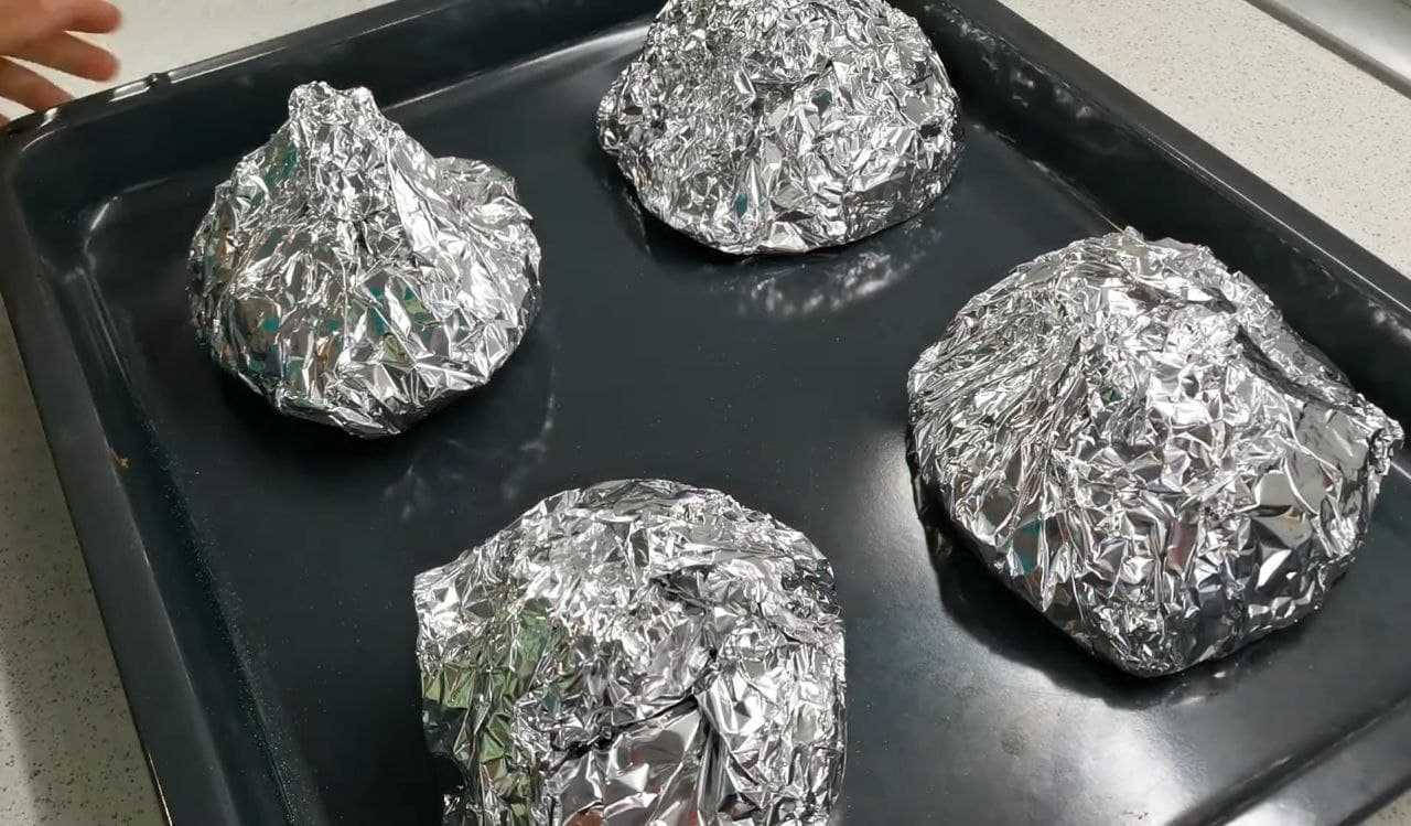 Противень, предварительно застелив фольгой, выложить на него курицу (так чтобы кусочки были рядом, но не соприкасались).