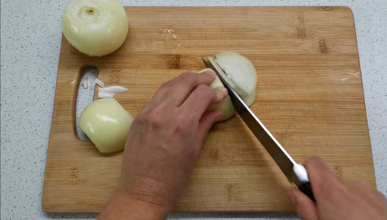 Шаг 5. Несколько крупных луковиц очищаем от шелухи и нарезаем достаточно толстыми колечками.