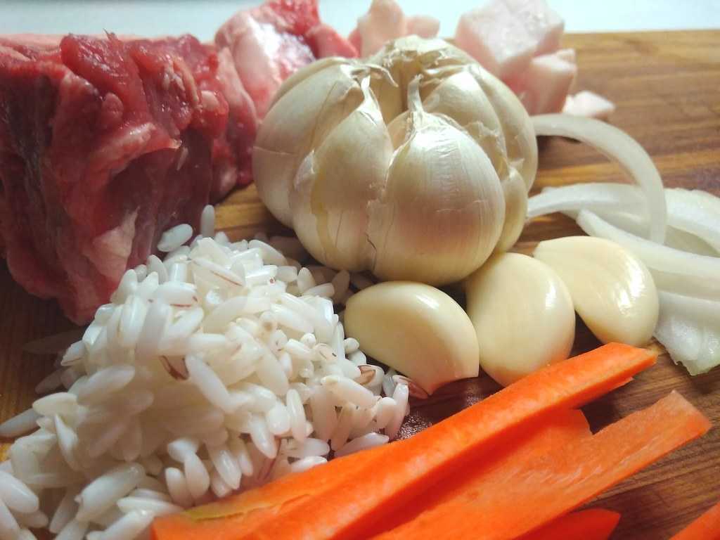 Приготовление: Нарежь мясо и овощи, разбери чеснок на зубчики и замочи промытый рис. Разогрей масло на сковороде и обжарь мясо на максимальном огне до румяности. Добавь лук, а через 5 минут морковь – и продолжай обжаривать.
