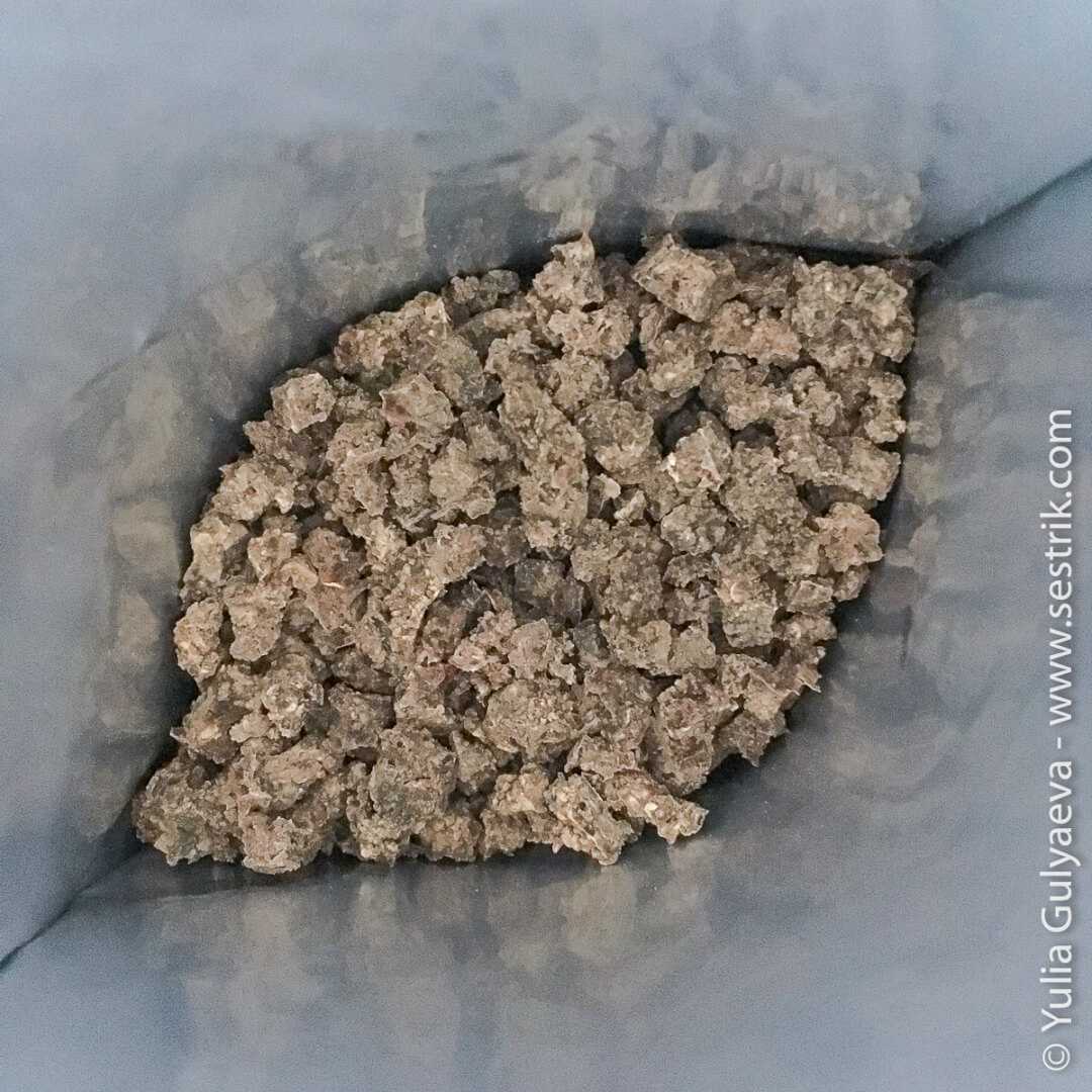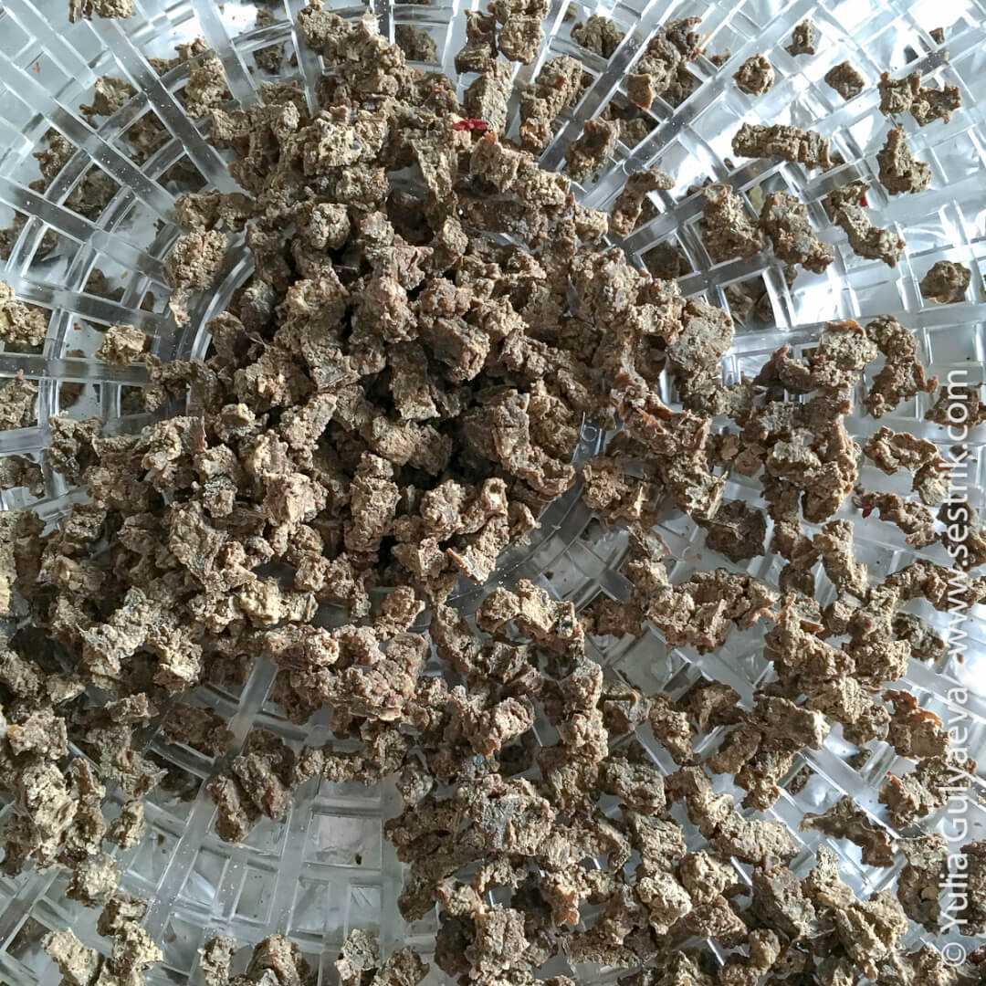 Выкладываем на поддоны сушилки и сушим. Получилась действительно паста-паштет. Я просто продавила ее сквозь отверстия на решетке поддона и таким образом у меня повисли вниз колбаски колобочки, которые высушились в такой вот фарш. Если просто положить паштет на поддон, он может не просохнуть.
