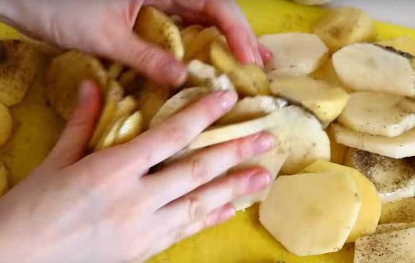 6. Тонкими кружочками нарежьте картошку. Посолите и поперчите её, налейте растительного масла и всё перемешайте.