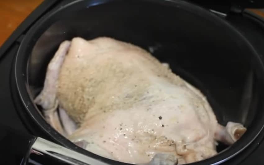 8. Дно и стенки чаши тоже смажьте небольшим количеством масла. Уложите птицу в чашу спинкой вниз и закройте мультиварку.