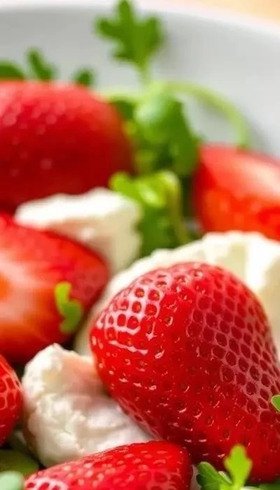 - Ингредиенты: Козий сыр (80 г), руккола (60 г), клубника (150 г), кедровые орешки (30 г), оливковое масло (2 ст.л.), лимонный сок (1 ст.л.).