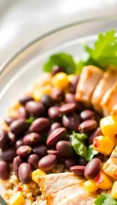 Приготовление: Отварите киноа. Обжарьте куриное филе. Нарежьте овощи и авокадо. Смешайте все ингредиенты и заправьте лимонным соком и оливковым маслом.
