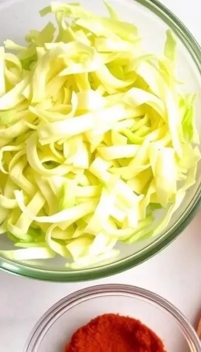 - Подготовка капусты: Тонко нашинкуйте капусту. Посолите и слегка помните руками, чтобы она стала мягче.