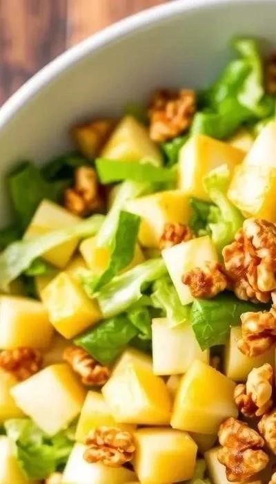 Ингредиенты: Пекинская капуста, яблоко, грецкие орехи, изюм, заправка (сметана, мед).