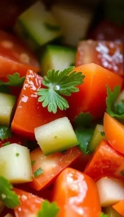 - Салат с кинзой и огурцами: Добавьте нарезанные кубиками огурцы для свежести и хруста.