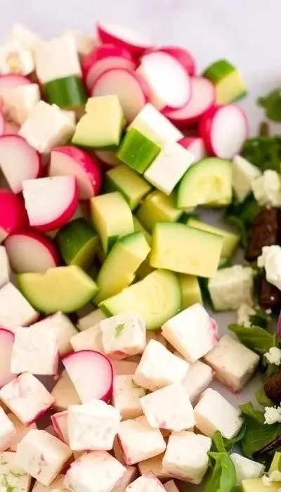 - С авокадо: Добавьте 1/2 авокадо, нарезанного кубиками. Авокадо придаст салату кремовую текстуру и полезные жиры.