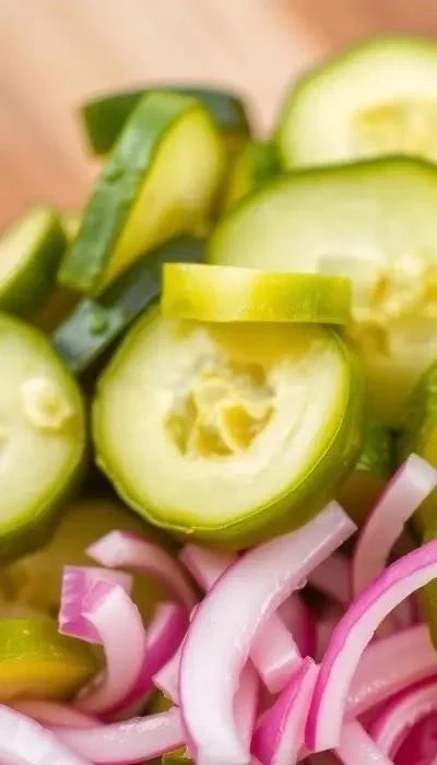 - Подготовка огурцов и лука: Маринованные огурцы нарежьте кубиками, лук – тонкими полукольцами. Если лук слишком острый, залейте его кипятком на несколько минут, чтобы убрать горечь.