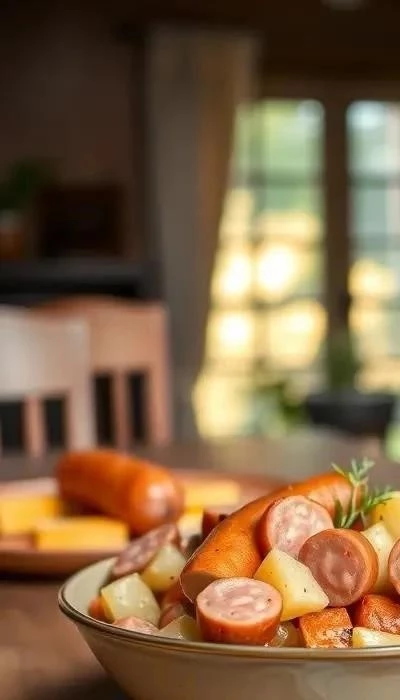 1. В большой миске смешайте нарезанный картофель, обжаренные сосиски и бекон.