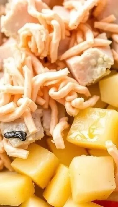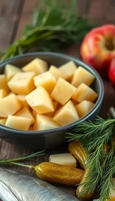 - Смешивание ингредиентов: В большой миске соедините картофель, сельдь, огурцы, лук и яблоко. Залейте заправкой и аккуратно перемешайте.