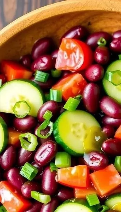 - Салат с фасолью и овощами: Добавьте в салат нарезанные кубиками помидоры, огурцы, перец.