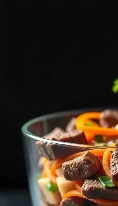 Салат с говядиной и корейской морковью лучше всего подавать охлажденным. Для красивой подачи можно выложить салат на блюдо горкой и украсить зеленью. Этот салат отлично сочетается с различными напитками, такими как красное сухое вино, пиво или сок. Он станет прекрасным дополнением к праздничному столу или простому ужину.