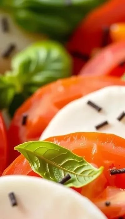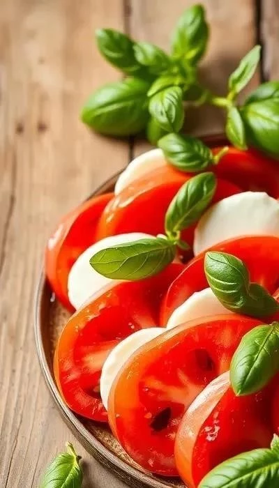 - Украсьте базиликом: Между кружочками помидоров и моцареллы положите листья свежего базилика.