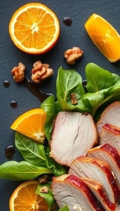 Ингредиенты: Утиная грудка (200 г), апельсин (1 шт.), салатные листья (100 г), грецкие орехи (50 г), оливковое масло (2 ст.л.), бальзамический уксус (1 ст.л.), соль, перец.
