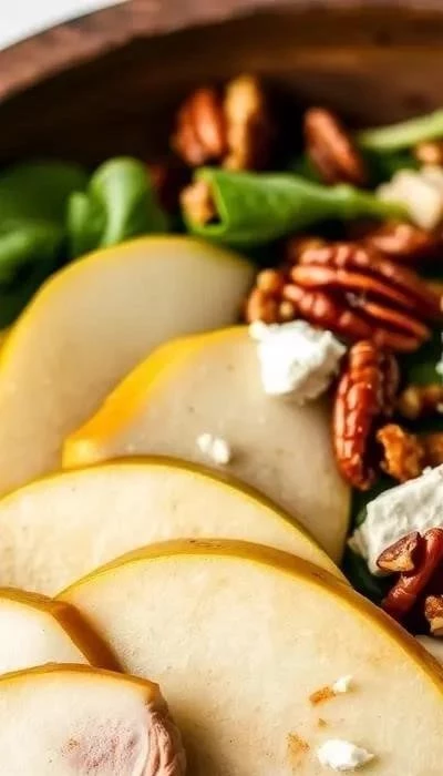 Ингредиенты: Утиная грудка (200 г), груша (1 шт.), салатные листья (100 г), грецкие орехи (50 г), сыр с голубой плесенью (50 г), оливковое масло (2 ст.л.), лимонный сок (1 ст.л.), мед (1 ч.л.).