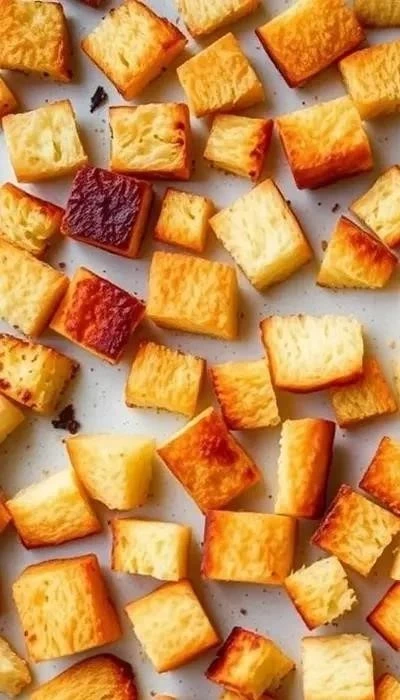 - Приготовление гренок: Нарежьте белый хлеб кубиками. Смешайте с оливковым маслом, измельченным чесноком и сушеными травами. Подсушите в духовке при 180°C до золотистого цвета.