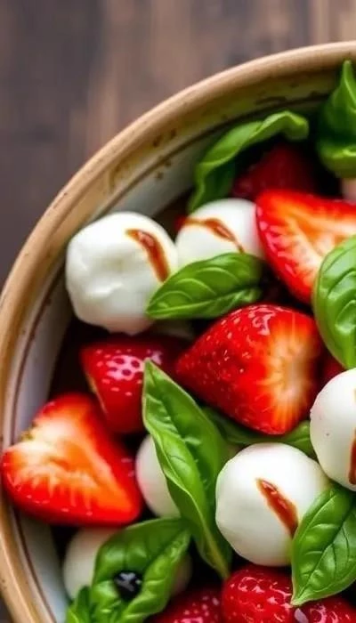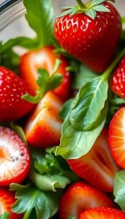 - Сборка салата: В большой миске смешать мацерированную клубнику, листья базилика, моцареллу (если используете) и рукколу (если используете).