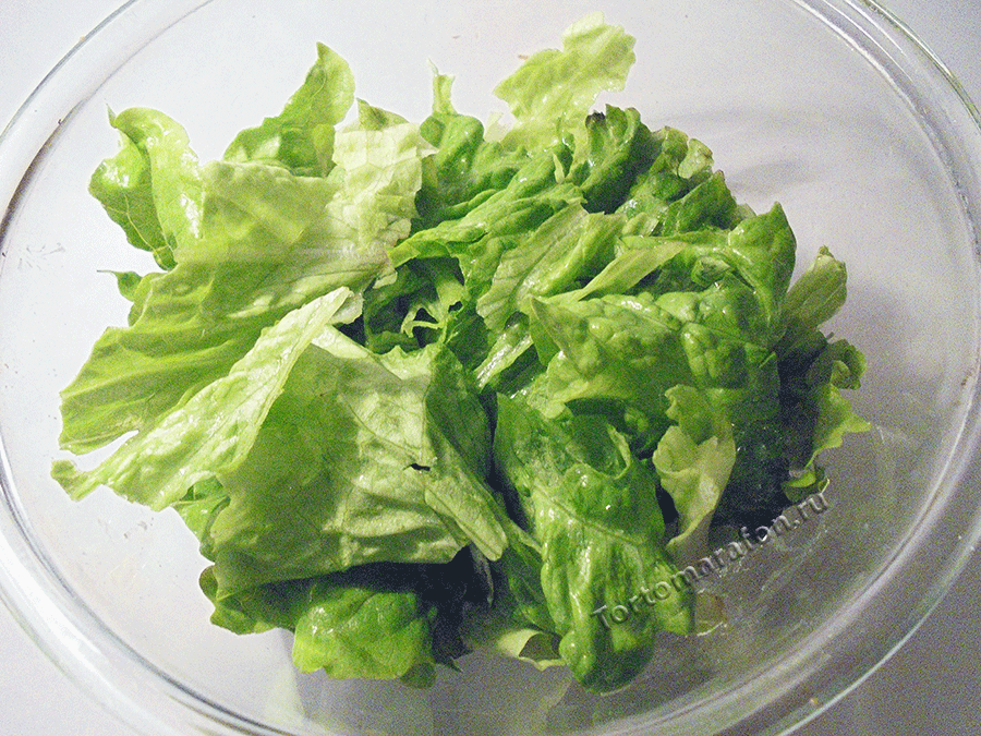 - Салат помыть и просушить салфеткой. Порвать руками или крупно нарезать.