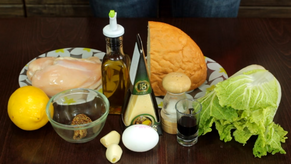 - Приготовить соус для салата. Почистить и пропустить через пресс чеснок. Выдавить сок из половины лимона. Натереть на терке 50 г пармезана. В чаше блендера смешать чеснок, лимонный сок, сыр, оливковое масло, майонез, горчицу, соль и перец. Взбить до однородной массы.