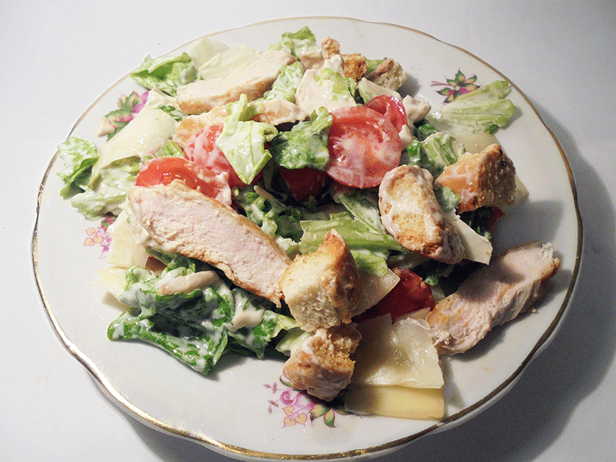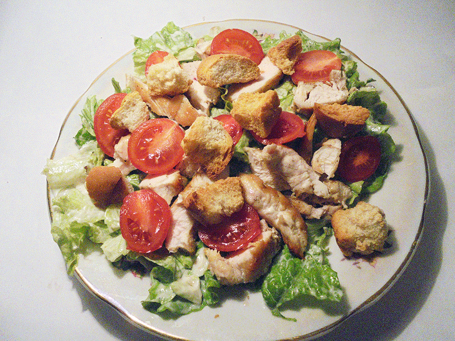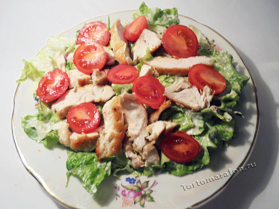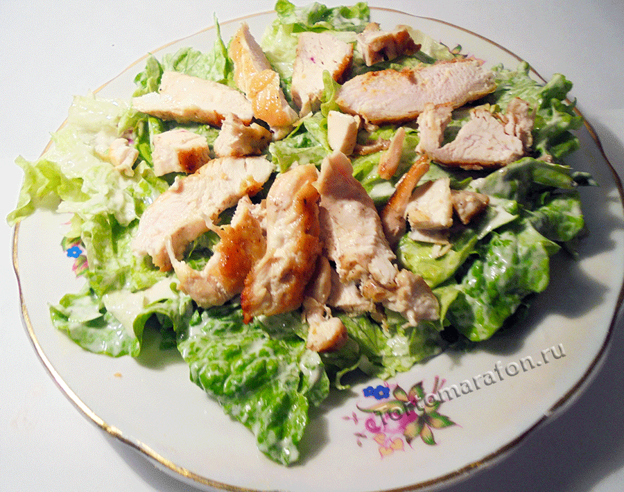 9. Положите в тарелку с салатом несколько ложек соуса «цезарь». Перемешиваем листья салата с соусом, поверх выкладываем куриную грудку, порезанную на кусочки.