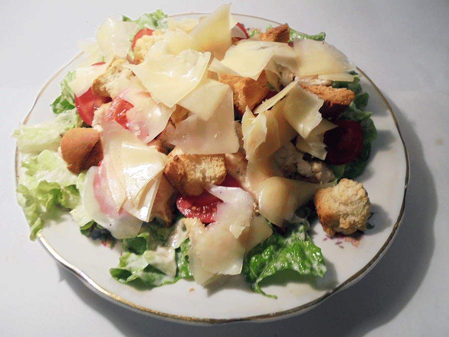 Осталось только собрать и подать «Цезарь». Помытые, обсушенные листья салата порвать на небольшие кусочки, отправить в глубокий салатник. Вместо ромена можно использовать другой вид листового салата, по вкусу, но в классическом варианте используется именно римский. Туда же положить курицу. Добавить немного соуса, перемешать. Сверху посыпать остывшими сухариками, добавить еще соус, перемешать снова. При подаче «Цезаря» каждую порцию посыпать тертым пармезаном, полить остатками соуса, украсить крутонами.