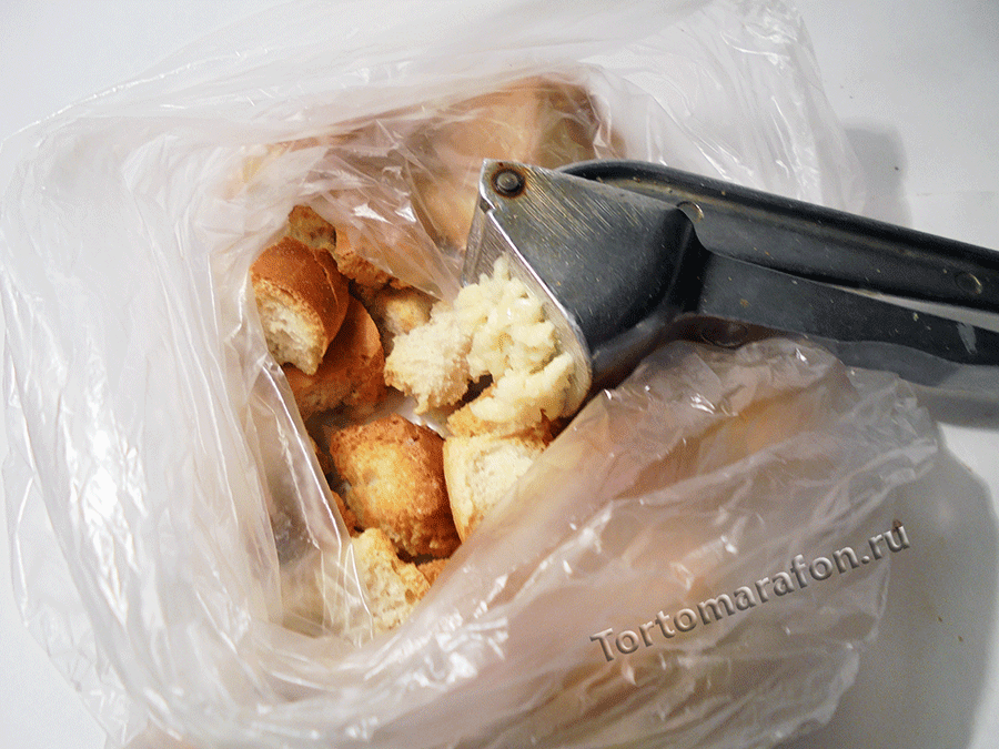 7. Выдавите через чеснокодавку несколько долек чеснока в пакет, добавьте туда же гренки и потрясите. Выньте сухарики из пакета, положите на тарелку для остывания.