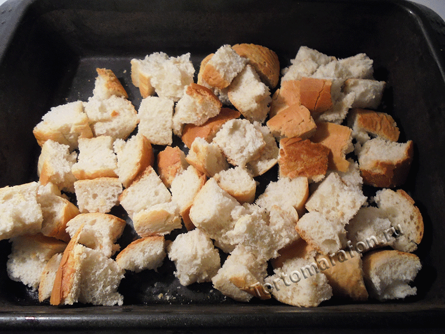 - Белый хлеб нарезаем кубиками. Здесь правил нет, иногда хочется покрупнее, а иногда помельче. Нарезайте как рука возьмет.