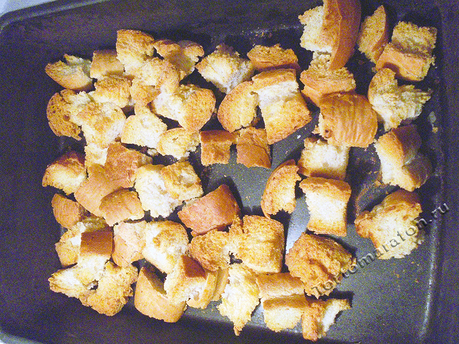 6. Запечь в духовке до состояния гренок. Но не слишком долго, чтоб были не очень твердыми. Можно вместо этого пожарить на растительном масле на сковороде с долькой чеснока (мне этот вариант больше нравится).