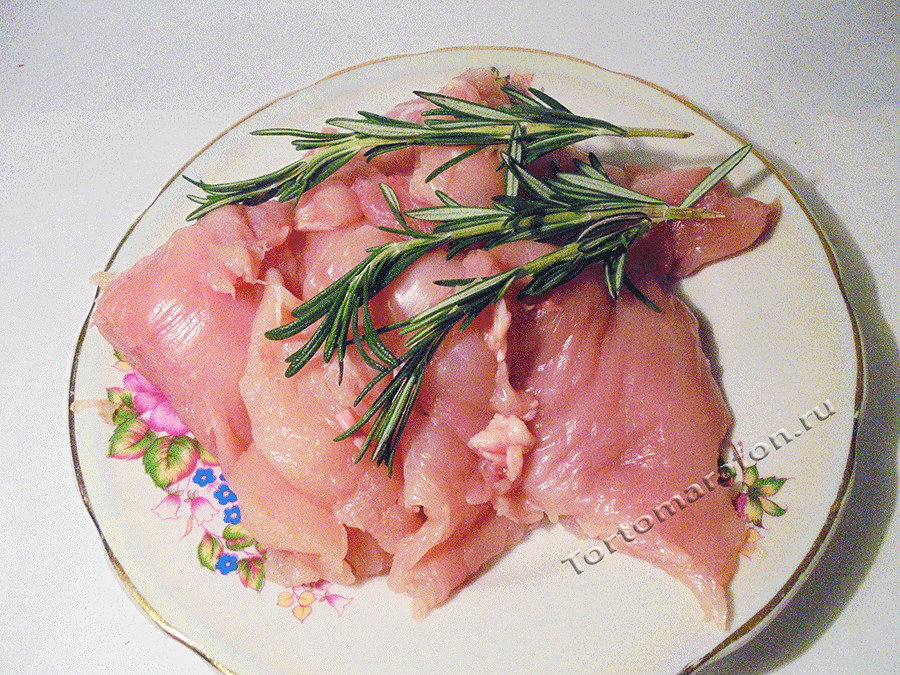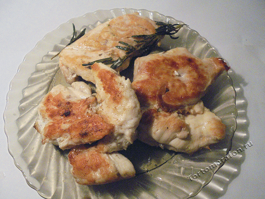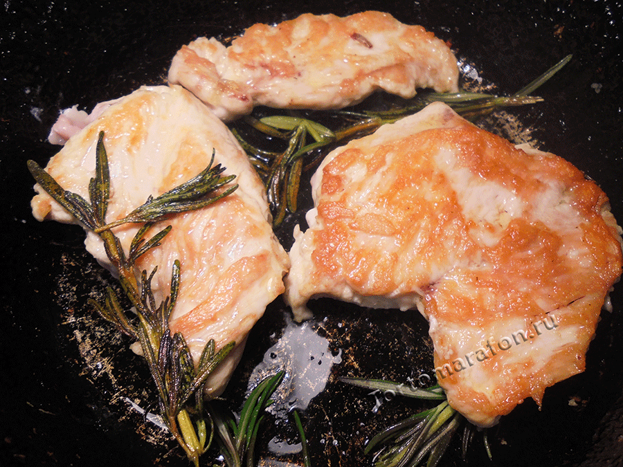 3. Получившееся филе посыпьте солью и перцем, и жарьте с растительным маслом и парой веточек розмарина (или другой ароматной травки) на раскалённой сковороде до золотистой корочки.