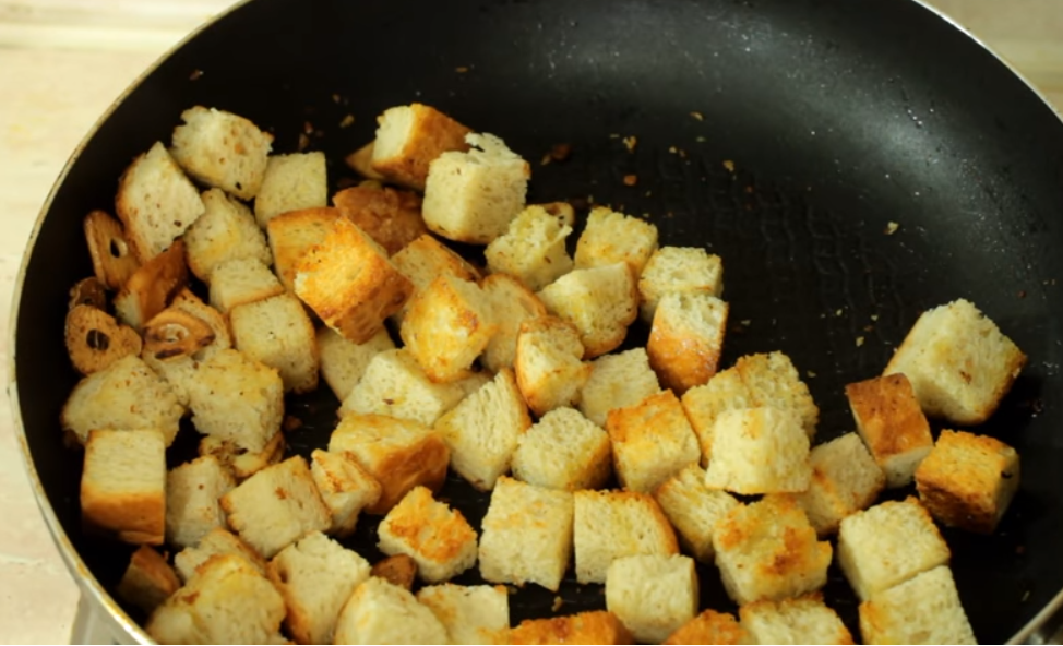 2. Хлебушек мы обязательно слегка обжариваем. На сковороду наливаем оливковое масло и сначала совсем немного обжариваем чеснок, нарезанный кружочками. Затем на сковороду выкладываем кусочки хлеба и обжариваем со всех сторон до румяной корочки. Готовые сухарики высыпаем в миску и даем остыть.