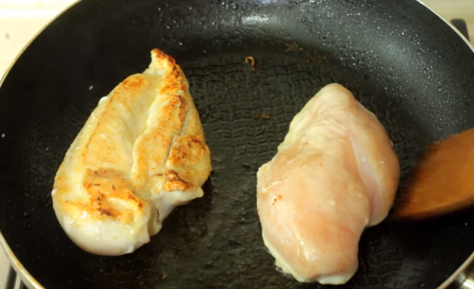 3. Куриные грудки немного присаливаем и обжариваем на оливковом масле с каждой стороны примерно по 7 минут. Кусочки должны слегка подрумяниться. Грудки можно немного поперчить по желанию.