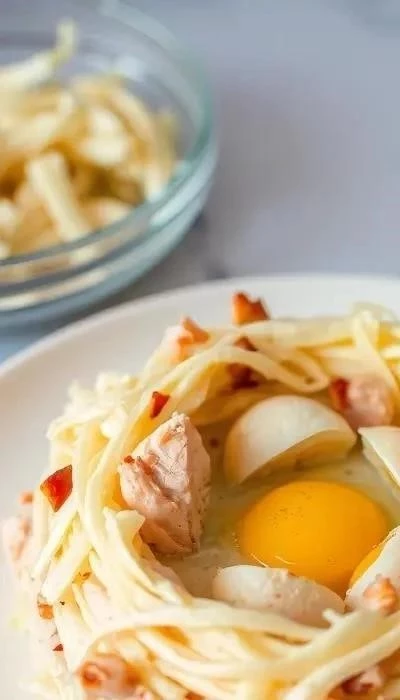 - Аккуратно выложите картофельную соломку вокруг салата, формируя «стенки» гнезда.
