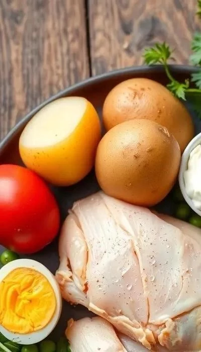 - Смешайте в миске куриное филе, картофель, яйца, сыр, ветчину и обжаренный лук.