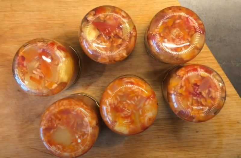 - в конце приготовления доведите все до кипения, влейте уксус, перемешайте хорошенько и тут же переместите овощную заготовку в стерилизованные банки, закатайте крышки.