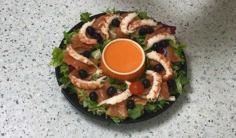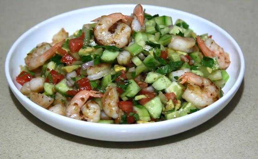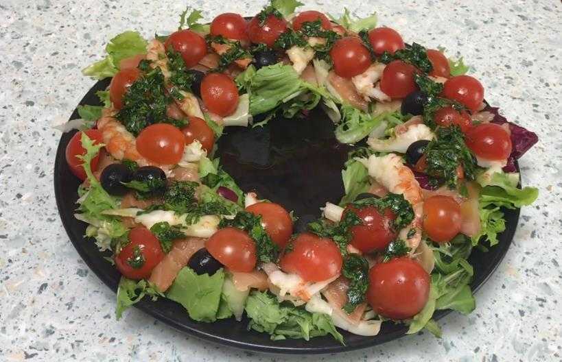 Салат из креветок и семги или лосося отличается ярким вкусом, оно понравится любителям качественных сочных морепродуктов. Поверхность готового блюда выкладывается целыми креветками, кедровыми орехами, веточками зеленой петрушки и икринками.