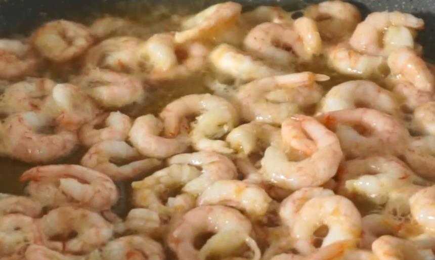 Натереть сыр на крупной терке, черри нарезать пополам. Маринованные креветки обжарить на оливковом масле до румяности.