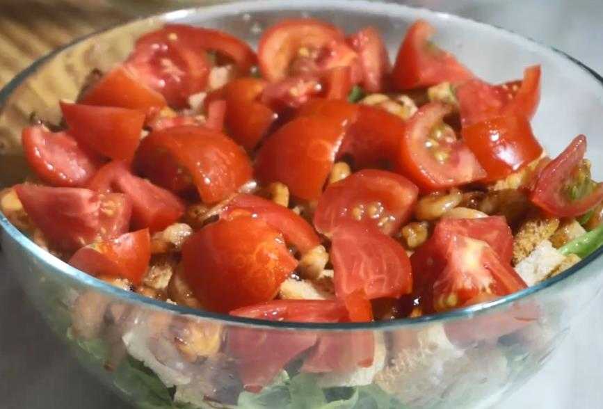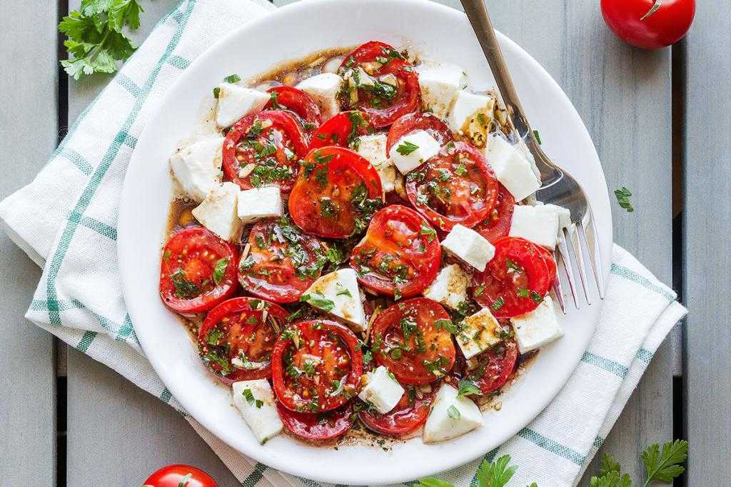 Это один из самых вкусных салатов из помидоров, который когда-либо придумывали кулинары. Он отличается относительно высокой энергетической ценностью и в случае необходимости заменит собою полноценный обед. Для его приготовления вам потребуется: