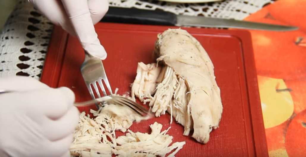 Отварить филе курицы. Оставив в бульоне (так мясо вберет сочность) охладить. Порезать не крупными ломтиками/кубиками (1,5х1,5 см – достаточный размер).