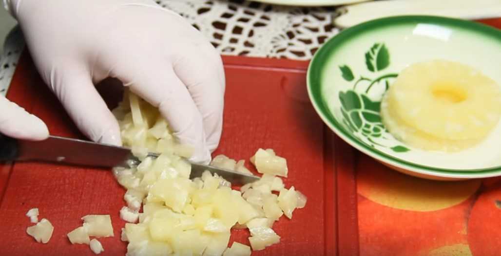 Ананасы можете купить уже нарезанные кубиками, а можете взять полукольцами и нарезать их самостоятельно.