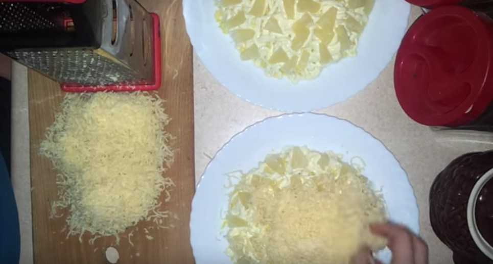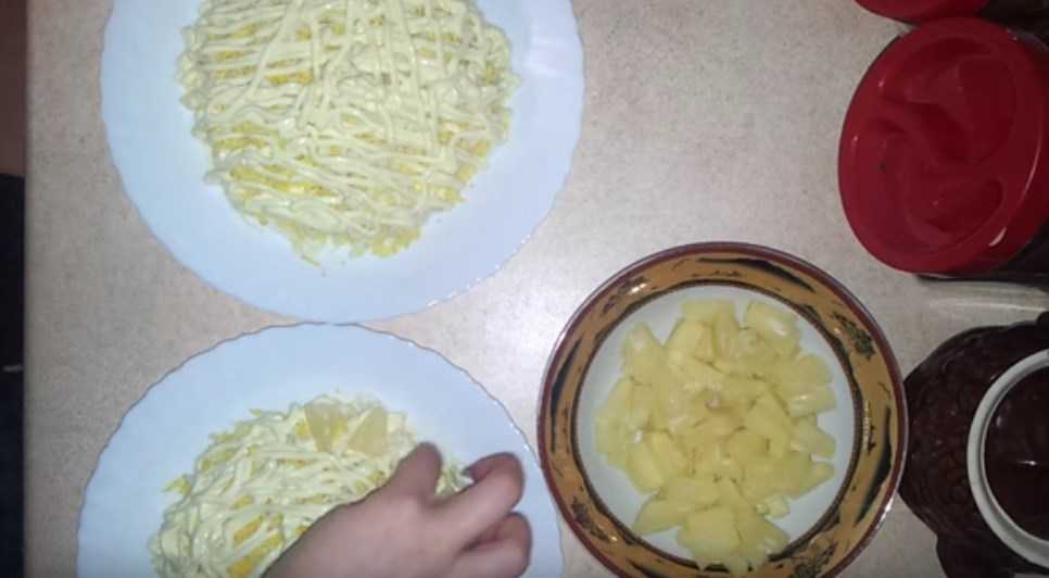 Салат с консервированным ананасом и курицей (куриной грудкой) и сыром слоями