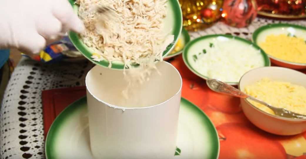 Салат с курицей и ананасами на Новый Год 2022, приготовленный слоями
