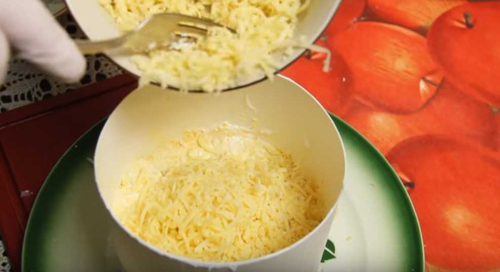 Следом кладем измельченный на крупной терке сыр, равномерно распределяя его по всему периметру. Не забываем о майонезе.