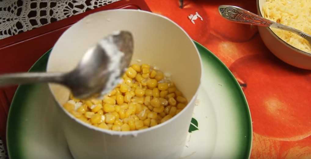 Соединить компоненты. Добавить кукурузу. Ввести – по ложке (лучше начинать с меньшей порции, чем с большой) – майонез. Перемешать.