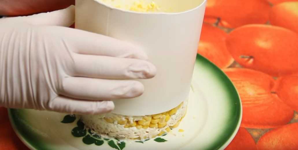 Этот салат очень красиво смотрится в прозрачной салатнице или на плоской тарелке. Чтобы увидеть слои можно использовать любую круглую форму, кто-то делает ее из картона, кто-то использует кольцо для выпечки бисквита, если оно небольшой формы.